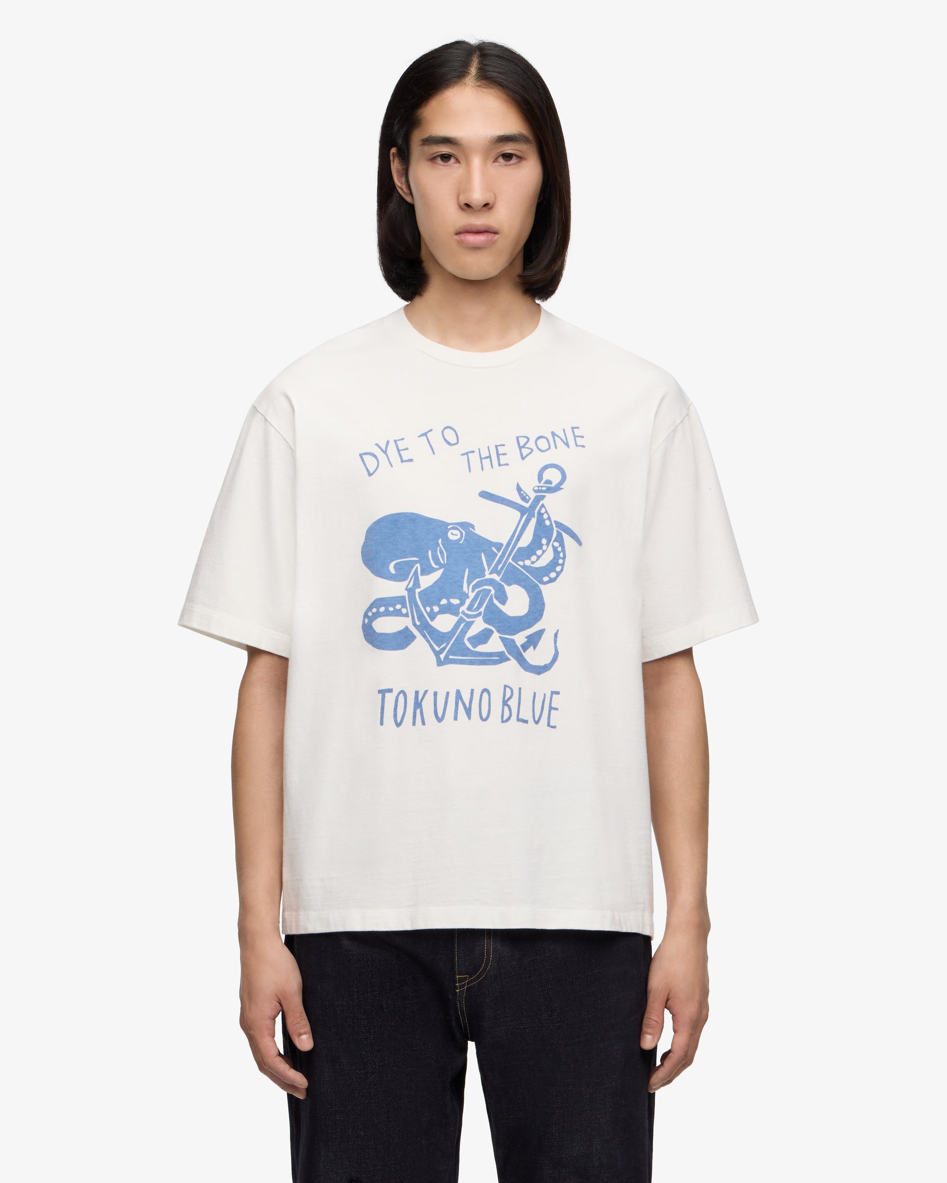 A graphic tee featuring the famous octopus of Shimotsui in Kojima. Graphics rendered through discharge printing.